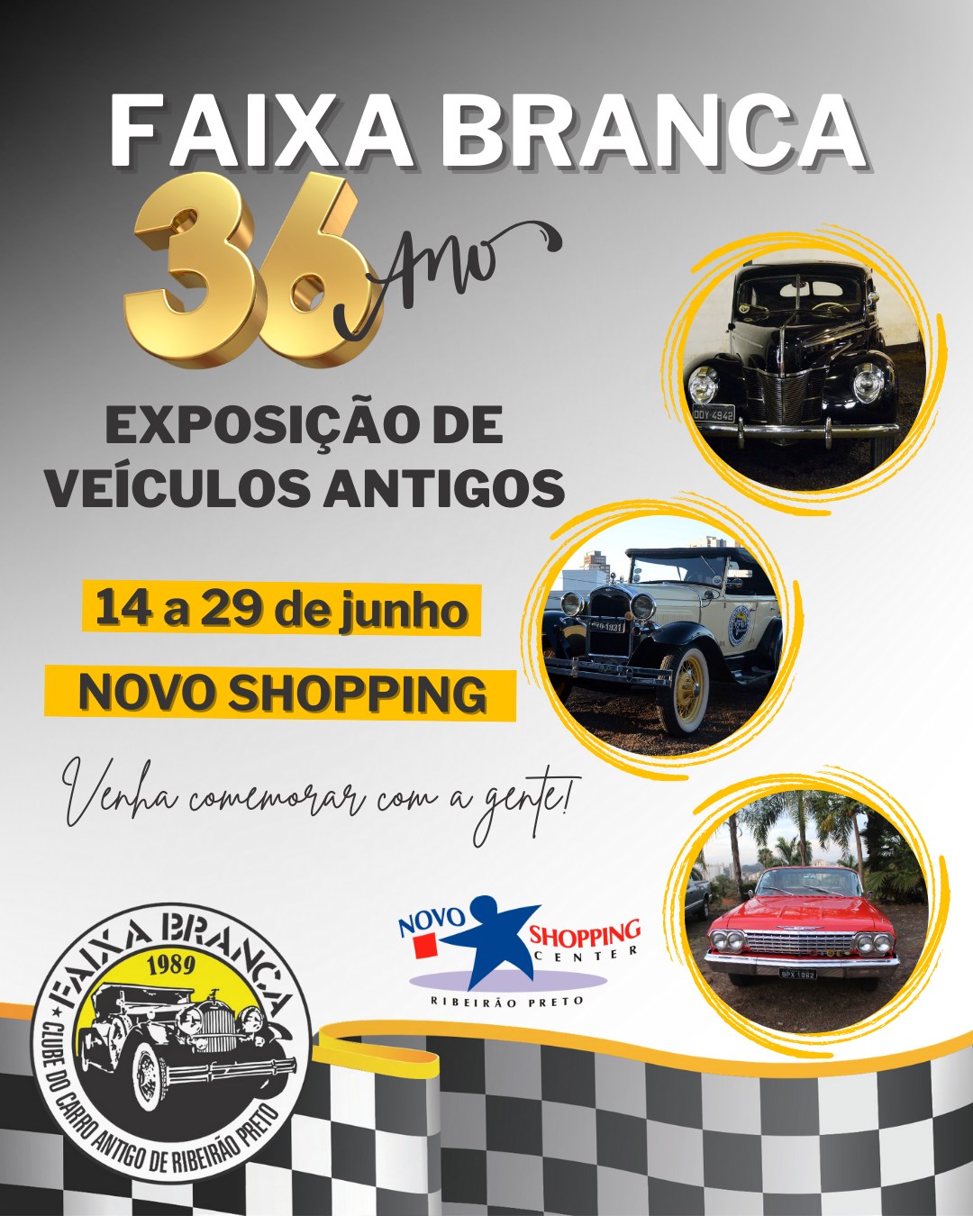 Em junho, o Faixa Branca – Clube do Carro Antigo de Ribeirão Preto, comemora seus 36 anos de fundação e convida toda a população para uma exposição especial de veículos antigos, que acontecerá de 14 a 29 de junho, no Novo Shopping.