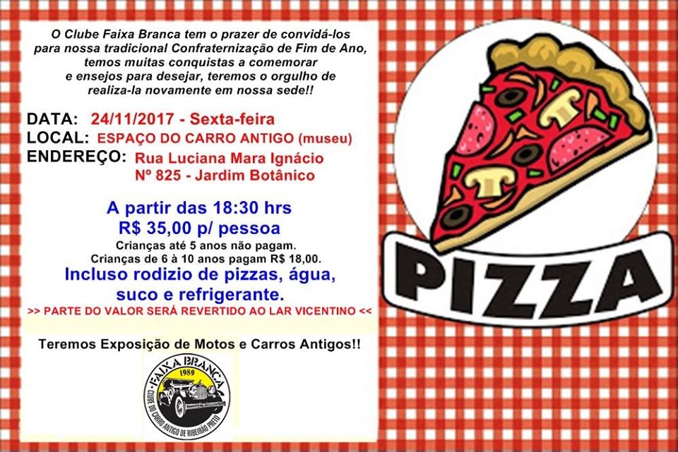 O Faixa Branca Clube do Carro Antigo de Ribeirão Preto realizará no dia 24 de novembro, uma confraternização de final de ano com associados, amigos e população em geral, onde parte do valor arrecadado será revertida à Assistência de Caridade Vicentina, uma entidade beneficente sem fins lucrativos, praticante da caridade cristã pela assistência social.